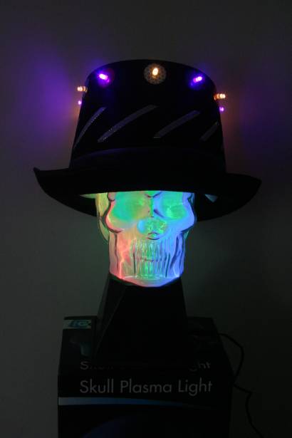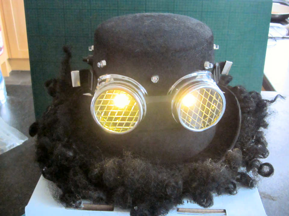 NOT WEATHERPROOF - The hat & battery box should not be allowed to get damp! N.B. Plasma skull was from Maplin - believed to be no longer available in UK. The example below is a "special build" with Silver Git Goggles, 1W warm white LED headlamps on manual switch + 8 purple flashing LEDs (and a lot of fake black hair)